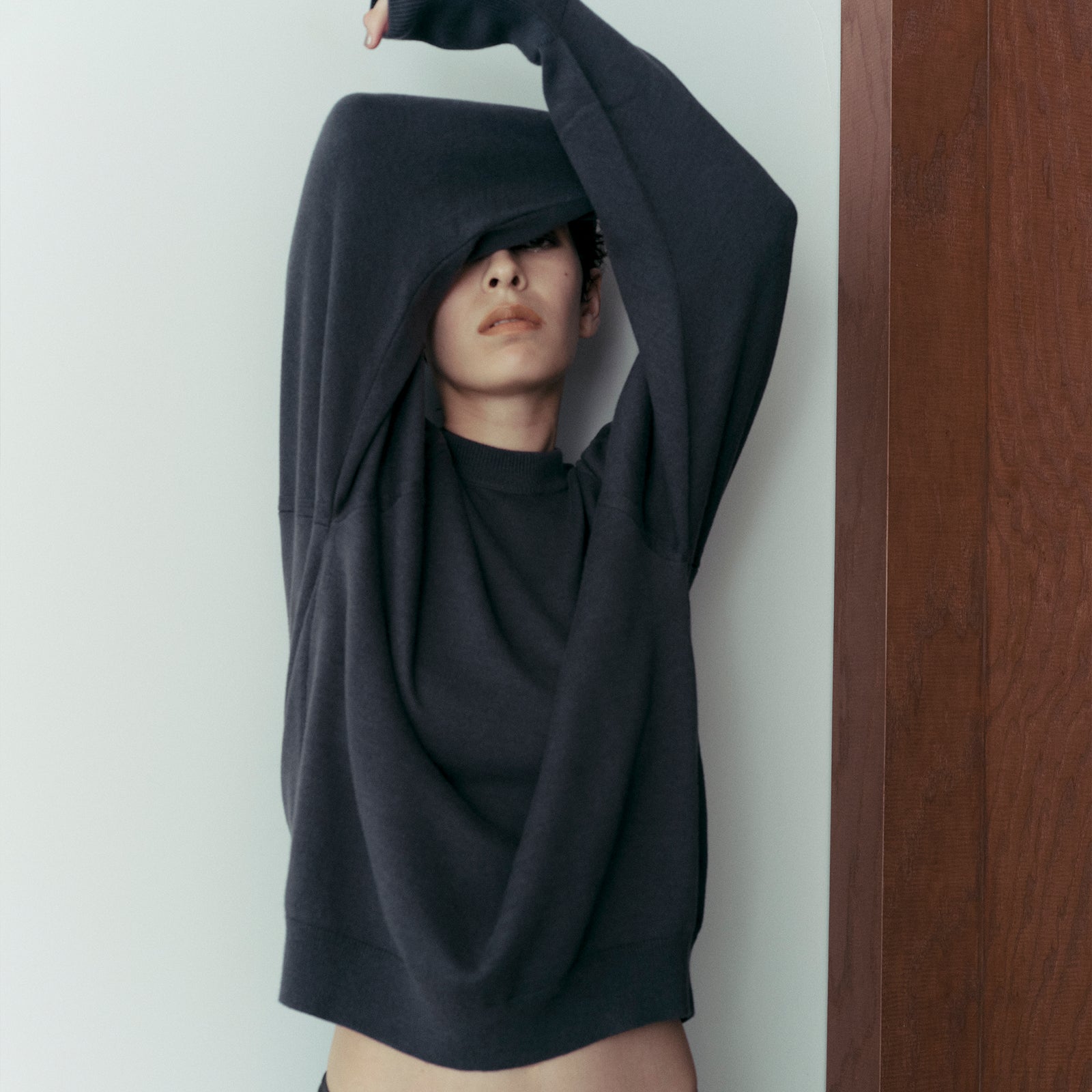 まるでカシミヤのような質感の糸で編んだホールガーメントのリラクシーなトップス。