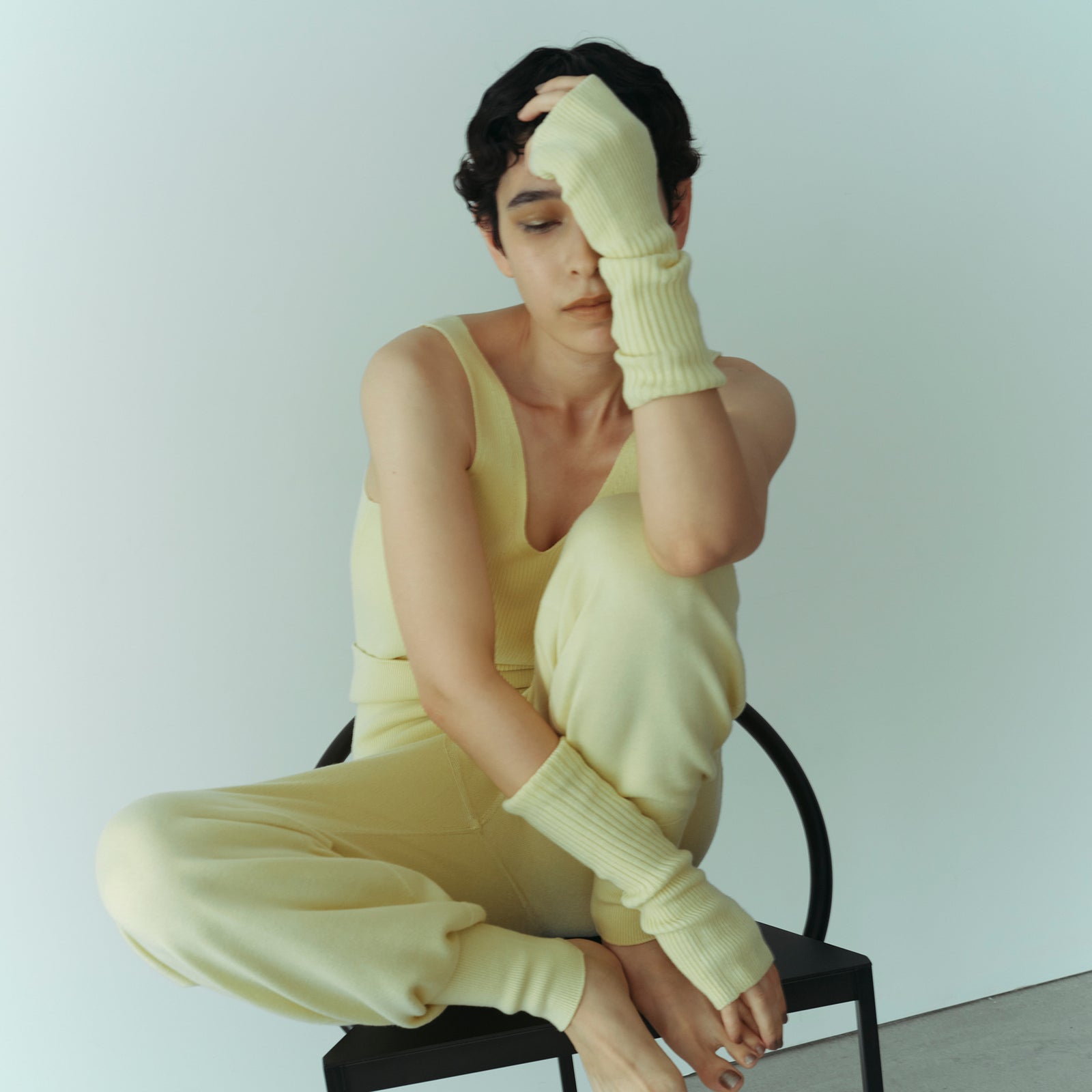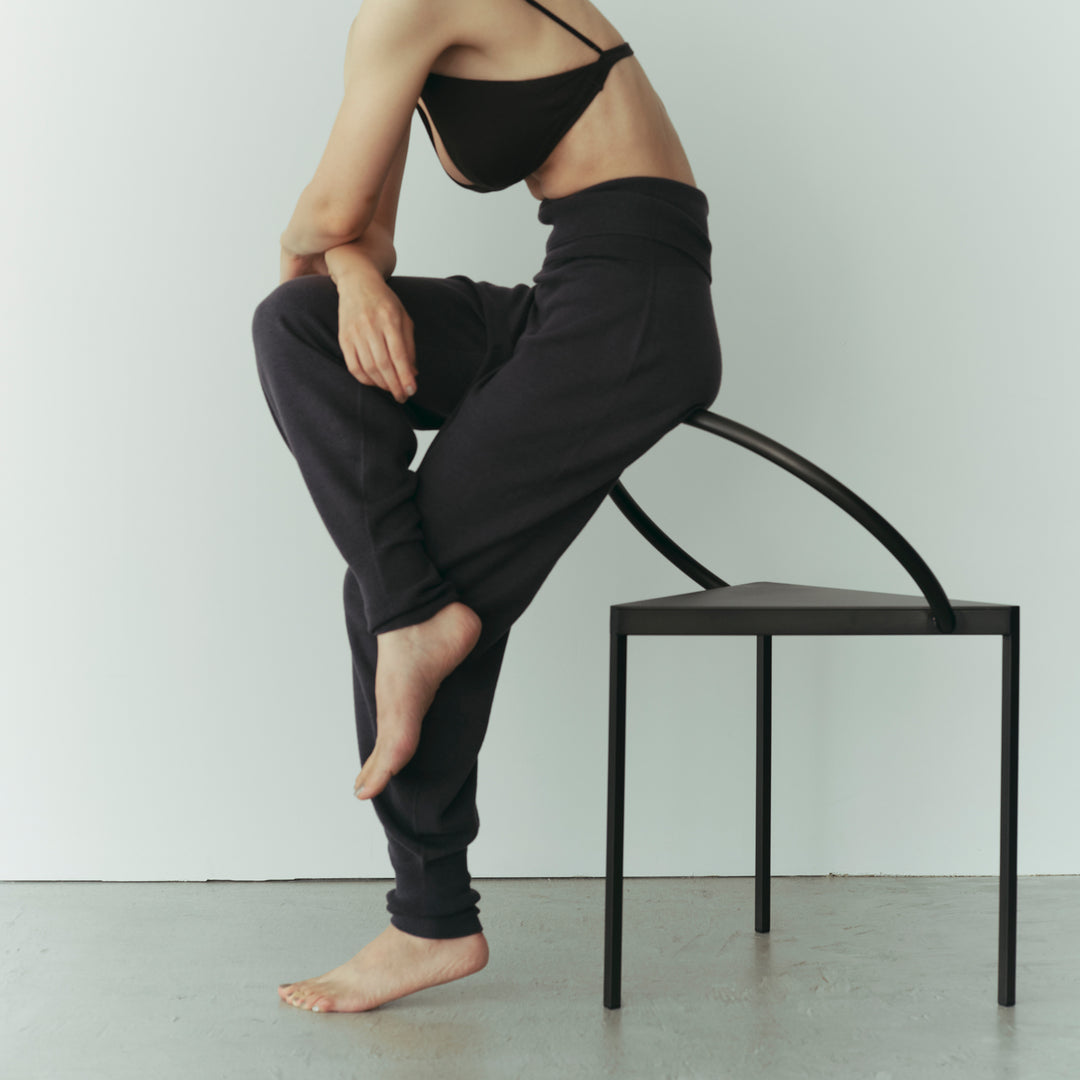 まるでカシミヤのような質感の糸で編んだ無縫製のリラクシーなボトム。